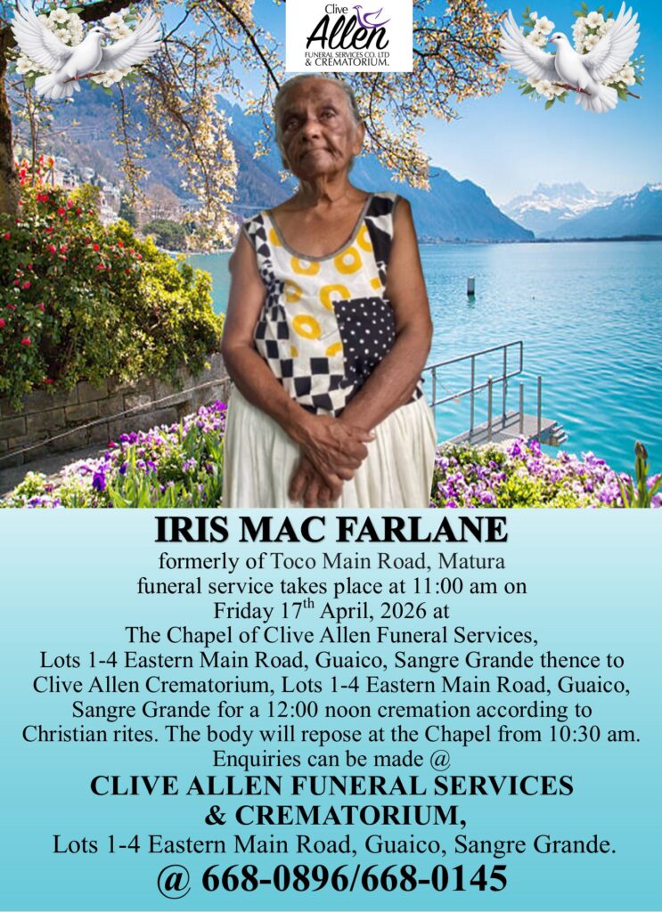 Posted inUncategorized IRIS MAC FARLANE Posted by By cliveallen April 16, 2026No Comments Share via: Facebook Twitter LinkedIn More cliveallen View All Posts Post navigation Previous Post KALAWATI PERSAD nee KATWAROONext PostEHINIA GALLAN